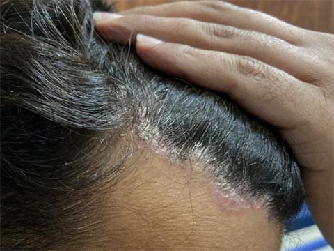 It’s a common skin disorder. It may look different on different skin tones. If the skin is dark, the patches may be purple and the scales gray. On light to medium-skinned, it often shows up as reddish, raised, or salmon-colored patches with white scales. It can be a single patch or more, affecting your entire scalp. It can also spread to your forehead, back of your neck & behind, and inside your ears. The scales may be itchy and looks like sliver coloured.