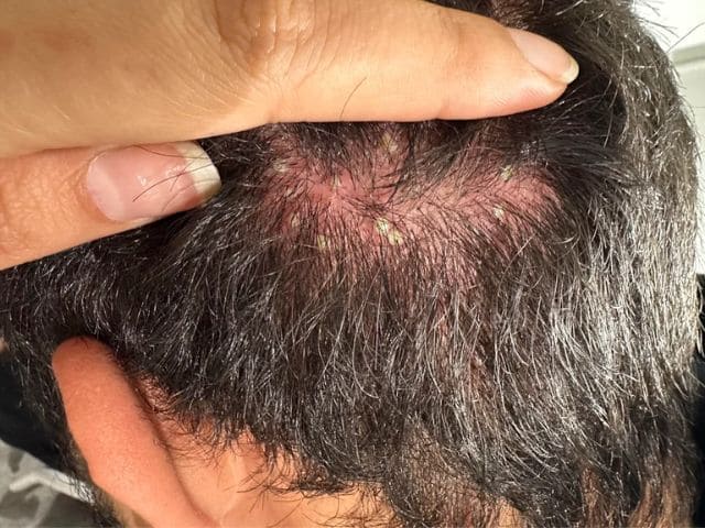 Folliculitis is a skin disorder involving the inflammation of hair The hair follicles infection or inflammation because of sebum or dandruff is known as seborrhoea folliculitis. On darker skin tones, it may appear darker than the surrounding skin and contain red, or purple hues. It can painful and pus filled over scalp and can affect beard also.
